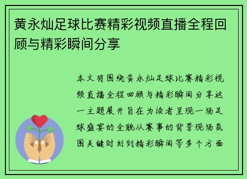 黄永灿足球比赛精彩视频直播全程回顾与精彩瞬间分享